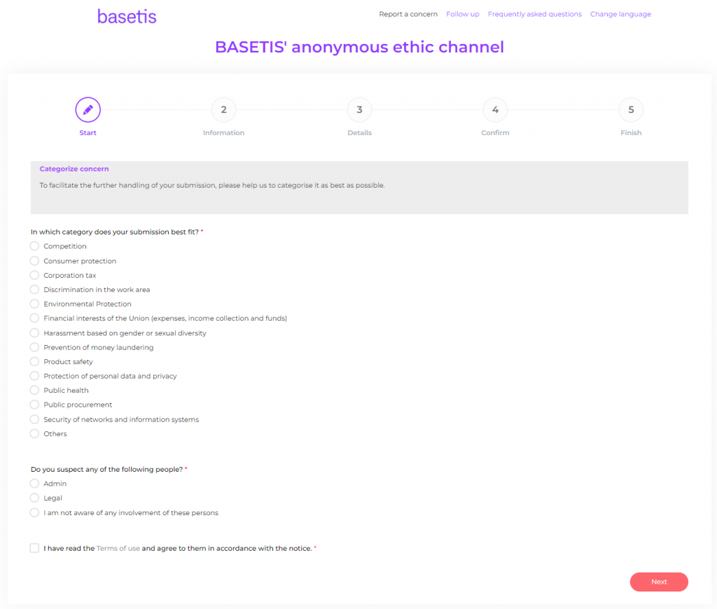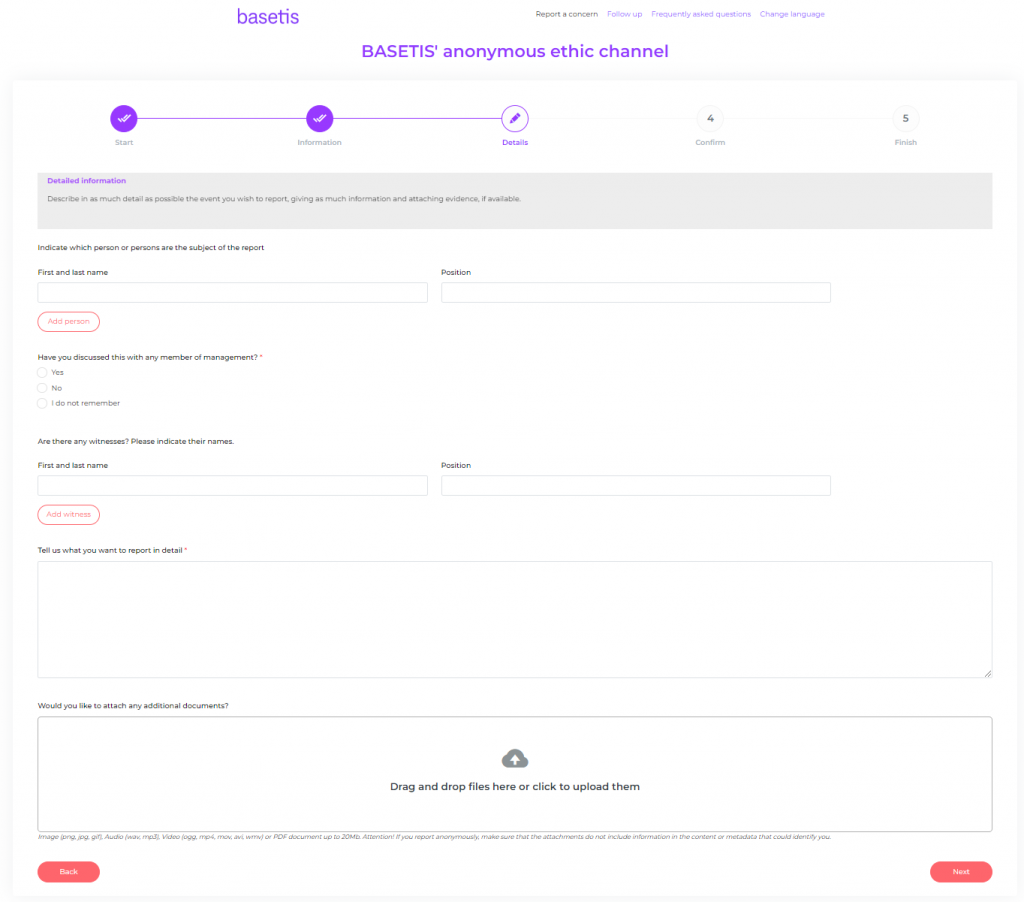 The system allows communication totally anonymous. Basetis will not allow in any case that any type of reprisal is adopted against the informants who communicate through this channel the facts that can be normative breaches in accordance with in force law.